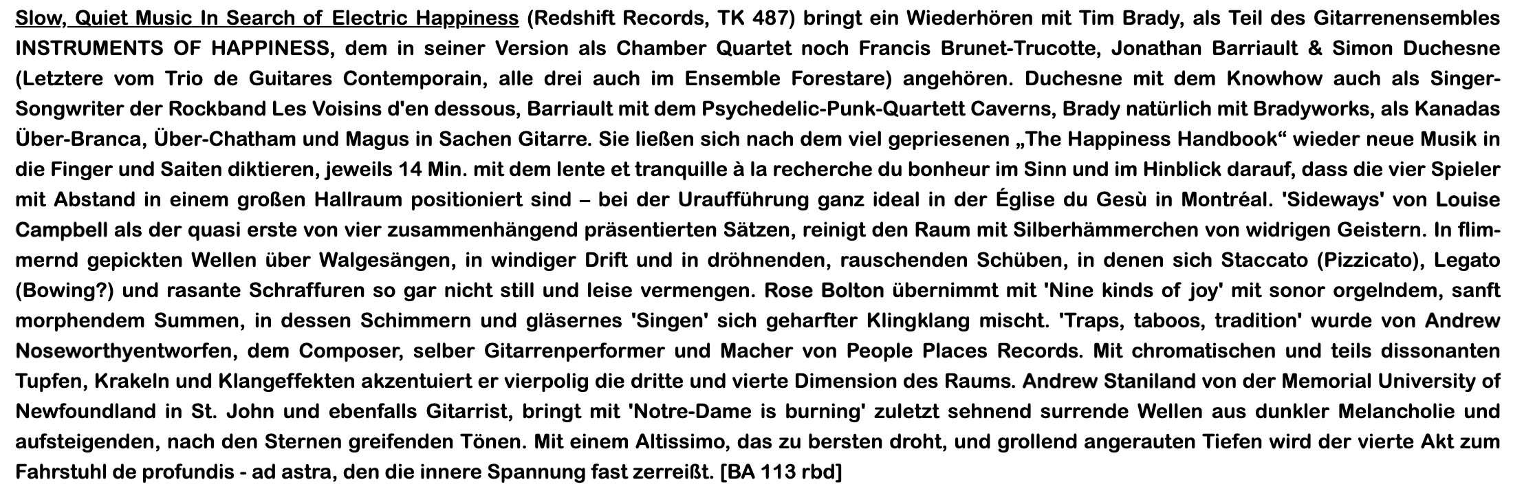 ABOUT: Montréal electric guitar ensemble Instruments of Happiness (led by composer/ guitarist Tim Brady) unveils their third release following a pair acclaimed discs for American imprint Starkland. Its title is quite descriptive of the music found on it; the works were all commissioned to be performed with the four guitarists scattered throughout a highly reverberant space. Yet there’s considerable variety found among its four compositions. Featuring acclaimed Canadian composers Rose Bolton, Andrew Staniland, Louise Campbell, and Andrew Noseworthy, the disc encompasses everything from plush sonic beds to elusive trickling textures, and from the unsettling to the sumptuous.