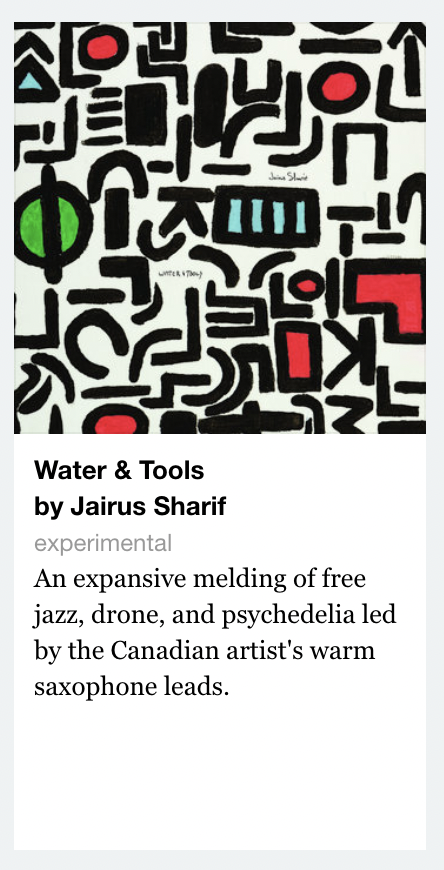 ABOUT: Since early 2020, Calgary-based improvisor Jairus Sharif has been generating a steady stream of passionate and unclassifiable homespun solo recordings that forge unprecedented connections between hip-hop abstraction, cosmic skronk, outsider jazz, and staunch post-punk DIY ethos. Water & Tools, his strange and stirring debut for Toronto’s Telephone Explosion Records (home to full-lengths from the likes of Brodie West’s Eucalyptus, Mas Aya, and Joseph Shabason), offers a glimpse into this ongoing hermetic journey. It’s a dense, contradictory statement with a blustery surface that shelters a soulful heart. It’s generous music, exuding profound vulnerability, all the while brimming with electric wide-eyed wonder.