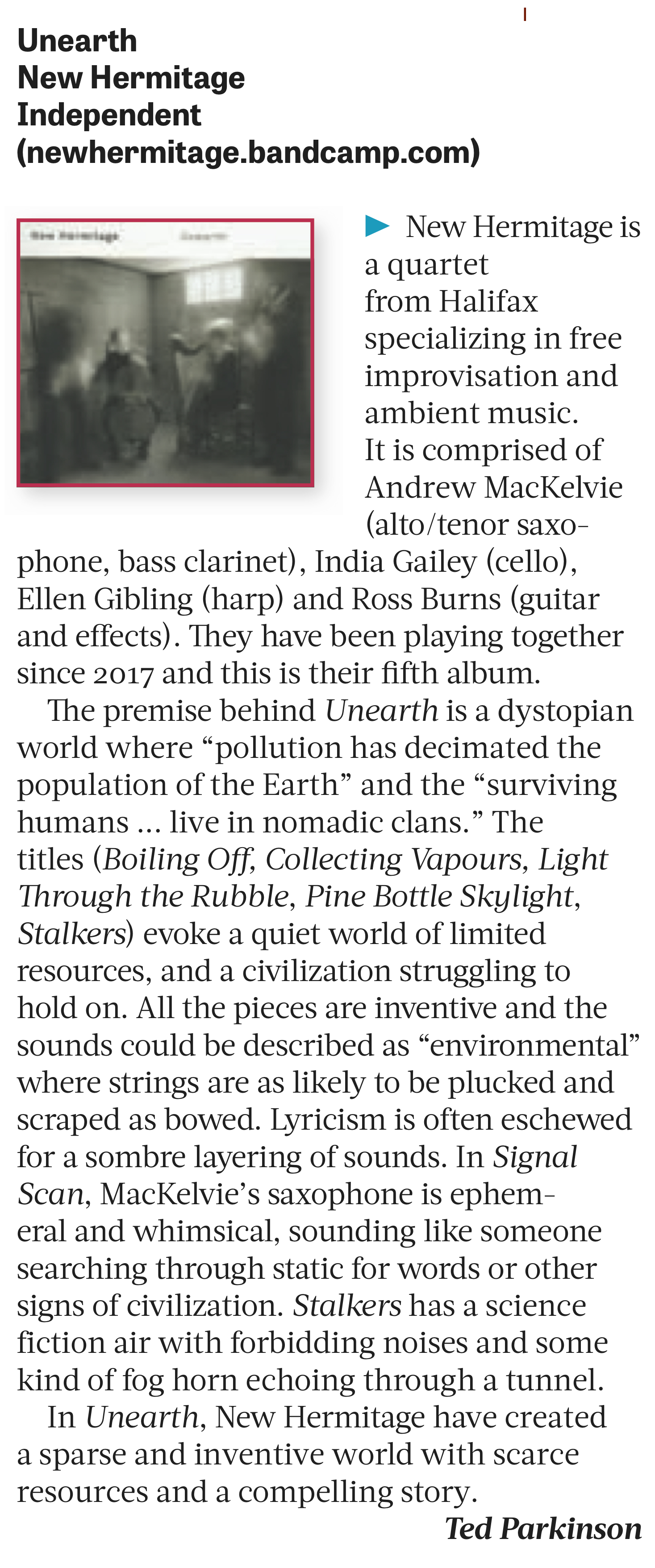 ABOUT: The fifth album by Halifax / Montréal-based improvising quartet New Hermitage, Unearth, unfolds through a series of whispered vignettes, offering the ensemble’s most focussed and cohesive statement to date. It follows the quartet’s collaboration with bass clarinet virtuoso Jeff Reilly, which won them a Music Nova Scotia Award for Best Classical Recording. Drawing on the spontaneous music practice of leader Andrew MacKelvie’s mentor/ collaborator Jerry Granelli, Pauline Oliveros’ Deep Listening™, and a vocabulary of eco-dystopian imagery this new record follows a dream-like logic. Deploying a unique instrumentation consisting of saxophones, cello, harp and electric guitar, they weave soft timbral impressions and tangled melodic evasions that sound like a half-erased chalk portrait of spiritual free jazz.