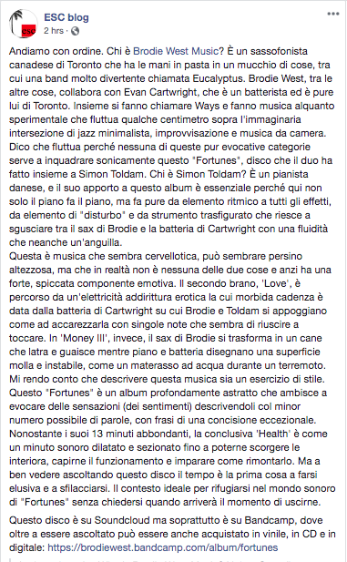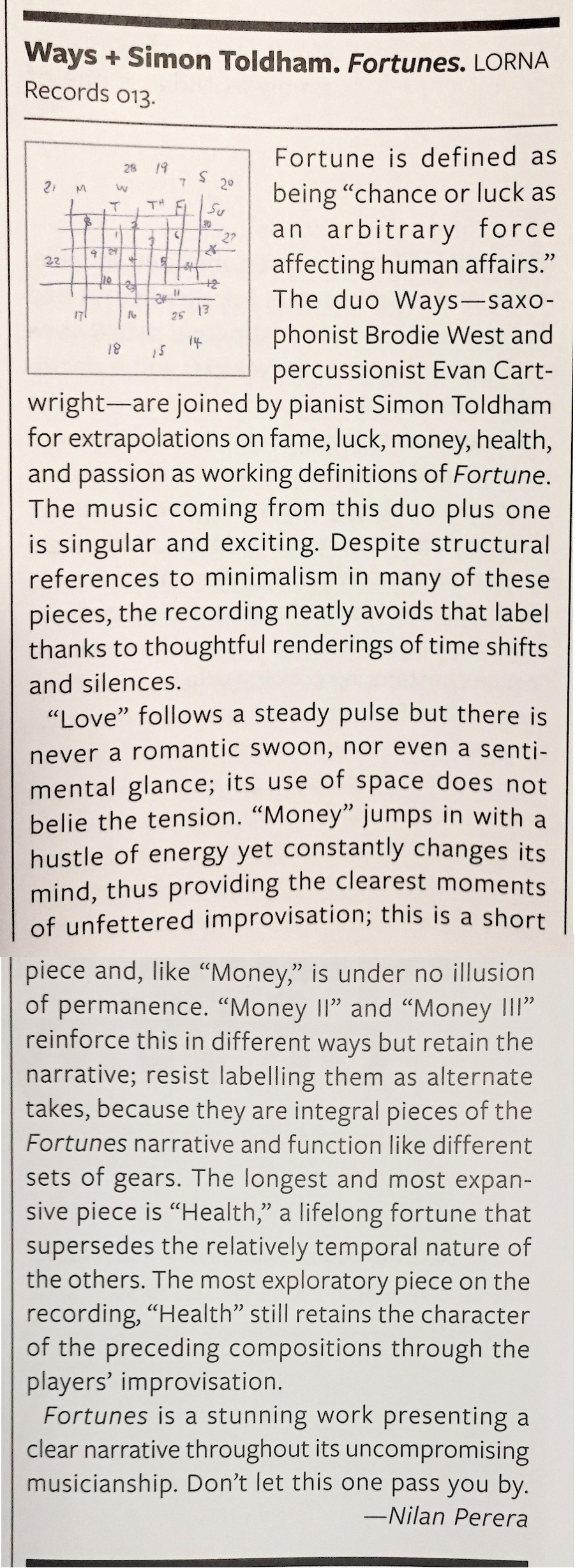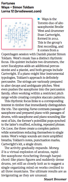 ABOUT: The elusive debut album of Toronto duo Ways featuring saxophonist Brodie West (collaborator of the Ex, Getatchew Mekuria, Han Bennink) and Evan Cartwright on drums follows after an appearance at the Newcastle Festival of Jazz and Improvised Music where they were joined by celebrated pianist Achim Kaufmann. On Fortunes they’re joined by a different European guest, Danish pianist and fellow Bennink collaborator Simon Toldam.