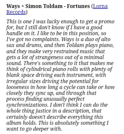 RIYL: Christian Wallumrød, Kim Myhr, Han Bennink, Christian Wolff, Morton Feldman.